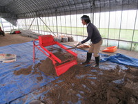 眞砂土、籾殻薫炭、米ヌカのボカシ(光合成菌で発酵)と混ぜて熟成させた培土を播種機に投入し易いように袋詰め(20kg位/袋)