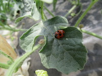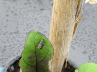 アブラムシ対策のため、前年は胡椒と混植したが効果なし。今年はネギと混植、黄色の粘着シートを張るがあまり効果なし。アブラムシが発生しだしたので、敷地内のナナホシテントウをかき集めてきてリリース。