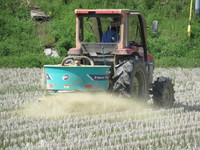 光合成菌ボカシ、貝化石を撒いて、トラクターで耕耘。