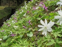 白い花(名前不明)と赤い花(カタクリ)が咲き乱れています。