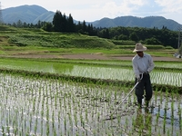 地下に除草作業は、田んぼの水を抜いて行いますが、雨で水が溜まって除草作業出来ません。