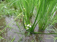 田んぼと稲の様子です。オモダカが白い花を咲かせています。