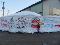 道路脇の雪の壁に絵が描かれています。夜には、雪の壁に掘った穴が灯篭になります。