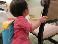 一升餅を背負わせて椅子につかまり立ちさせたら、