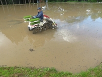 当農場では、午前中に代掻き、午後から午前中代掻きした田んぼに田植えをします。