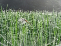 普段は良く見えませんが、早朝の朝露がある時間帯は、田んぼに張り巡らされた蜘蛛の巣にも露が付いて、蜘蛛の巣が害虫から田んぼを守ってくれているのが分かります。