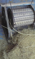 そこで登場してもらったのが、この「足踏み式の脱穀機」です。昔懐かしい、足踏みミシンのようなペダルが(写真の裏側)あり、これを踏むと、針金が無数についた回転部分が回り、稲穂から種籾だけを脱穀する仕組みです。おそらく明治時代の道具でしょうか。当時は画期的な発明品だったんですね。回してみると面白いように脱穀が進みます。江戸時代からの「千歯こぎ」と比べれはおそらく飛躍的な能率UPだったのでしょうね。