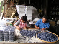 今年も雨が多く、大変な気候ですが、雨の日も晴れの日も毎朝4時からブルーベリーの摘みとりは始まります。その日のうちに、選別し、発送します。