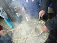 (私たちも、白毛餅入りのトン汁を作るのは初めての経験です)