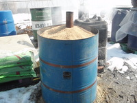 撹拌機で米ぬか・もみ殻・糖蜜等を混ぜ合わせ、ドラム缶に詰めます。
