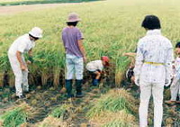 • 消費者の皆様と秋の稲刈り交流会。子供達も鎌で頑張りました。