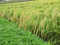 山際の田んぼで、沢水だけを利用したJAS有機米。魚に由来した有機物肥料が食味を向上させると聞いて、静岡県から取り寄せた肥料を使って育てたお米(暮坪米・暮坪米あや)など。稲の1本一本に陽が差し込むように疎植栽培にし、元気な稲。