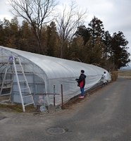 風がないのを見計らって、早朝5時から育苗ハウスのビニール張りです。