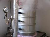 当組合で栽培した16年産こがねもち(米)を、専用の蒸し機で蒸して、この後杵つきの機械で餅を搗きます。