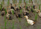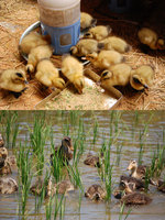 生後数日の合鴨のヒナと、田んぼを泳ぎ回って雑草や虫を食べる合鴨