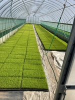 お米専用のハウスに移し替えた苗が10cm程までに成長しました。青々としてしゃんと立っています。コロナに負けるなと言わんばかりスクスクと育っています。これからもハウス内の湿度や温度を気候に合わせ調整しながら育てていきます。このまま、順調に育てば4月下旬にはいよいよ、田植えがスタートします。
