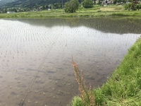 田植え後間もなく、カモらしき鳥がって来た。しばらく観察していると、頭を水の中に突っ込みなにかを食べているようだった。今年は近づいてもしばらく逃げないで田んぼの中を泳ぎまわっていて可愛いな。