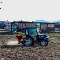 トラクターの後ろに肥料散布機を取り付け、田んぼに振りかけていきます。