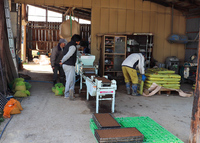 種まきは事前の段取りが大事。前日にオート播種(はしゅ)機と育苗器(発芽機)を小屋に設置し、作業当日は各自持ち場に陣取り、流れ作業で効率よく進めていきます。