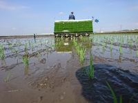 田んぼに紙を敷いて、雑草を抑える、紙マルチ田植です。
