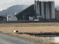 そんななかのたにの施設の手前の農道を通ると、冬にも水を張ってコウノトリえさを育てるコウノトリ育む田んぼで、コウノトリさんが食事中。ここでは、僕が通ると不思議と出会います。
