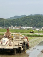 5月4日から始まった43haの田植えも7割消化。手前の田植機は熊谷くん、むこうの田植機は草壁くん!どっちもじょうず!