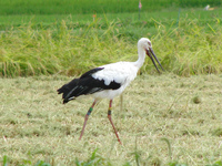 うしろでコウノトリがコンバインが動き出すのを待っています。えさになるバッタやカエルが動くのを待っているのです。コンバインについてくるんですよ。