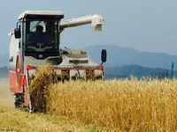| 濡れると駄目なので、麦がよく乾いた晴れ間に急いで収穫します。 |