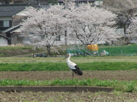 コウノトリも降りてきて、事務所とサクラをバックにコウノトリをパチリ!