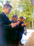 手前から、若手の農業の代表、農会長の秀ちゃん、百段以上ある階段をフウフウいいながら上がってきた哲ちゃん、今年の区長さんのまもるさん、そして私、組合長の小島です。