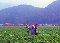 今日は、減農薬栽培の一番の悩み、大豆が倒れないように土を寄せる処理を遅くまでする小島組合長をパチリ!