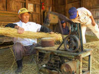 画像は、秋祭りの八幡神社のしめ縄づくりの様子です。作り方も機械の使い方も今のうちに教えてもらわなきゃ!