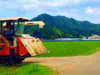 画像は、なぜか田植えをした後のたんぼの農道にコンバイン!?