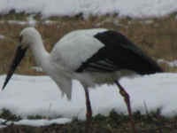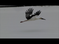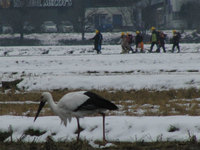 | 雪の田んぼと、えさとりコウノトリ |