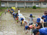 今年は地元JAさんのあぐりキッズスクールの会場を当組合が受けました。25周年記念でもあり、地元の小学生30名に年間通して農業体験していただきます。豊岡が好き、自然環境を大切にする子どもになってほしくて。写真は六方銀米の手植え風景です。