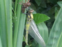 うちの前の溝には、毎年この時期の朝は、トンボの羽化が見れます。これはけさのトンボです!
