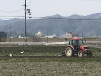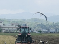 GW返上、5月3日から田植えを開始します。トラクターの後ろで餌を探しているコウノトリです。もうすぐ子育てかな?