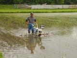 田植えして10日位です。苗は、根付いていますがまだまだ小さいです。草の芽が゛出ない内に苗と苗の間の地表を攪拌して草が生えてくるのを抑えて稲が元気に成長するようにするのが、目的です。体力が必要なので、理想どうりに行かないときも有ります。