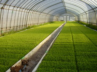 四月七日に蒔いた、ひとめぼれの苗をハウスに並べています。五月の田植えに向かって育苗スタートです。