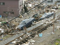 石巻から気仙沼間の気仙沼線のそば家も車もガレキと一緒に流されてしまった残骸、