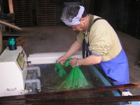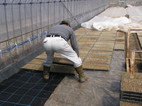 これを、育苗ハウスに並べ、遮光ネットで被い弱い光をあてて、緑化します。2〜3日で緑色になります。