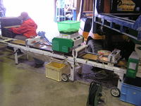 機械に、床土を詰めた箱を流します。次に水をかけ、種をまきます。その上から、土をかけます。