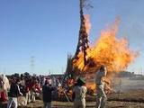 今年は1月11日の日曜日にどんと焼きが行われました。どんと焼きは、子供達がどんと小屋を作り無病息災を祈る行事です。写真は前回の農場便りでお伝えしたどんと小屋が燃えているところです。小屋の大きさは約10メートル前後の大きな物になります。今年は西風が強く、活きよい良く燃え上り写真のとおりの光景です。火災の心配?ご安心下さい、田んぼのど真ん中に立ててありますので心配いりません。(田舎ならではの光景です)火が落ち着いたころに、篠にさしたお餅をこの炎で焼き一年間の無病息災を祈り、お餅を食べます。