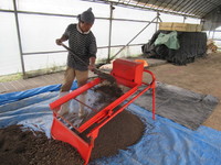 真砂土、籾殻薫炭、光合成菌ボカシと混ぜて馴染ませていた苗箱用の培土を播種機に入れ易いように袋詰め。