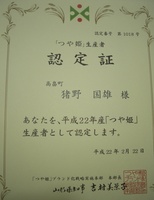 「つや姫」の栽培認定書