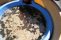 最初の仕事は毎年これです「塩水選」(塩水の中に籾を入れると比重の軽い籾は浮いてきますのでそれを取り除いています)