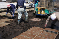昨日紹介した芽が出たばかりの苗を田んぼへ移します。取り合えず一回目は3000枚の苗を田んぼで出しました。