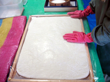 12月限定の餅つき開始いたしました。餅米には「こがねもち100%」を使い手間暇掛けて餅つきをします。写真は餅を伸しているところですね1日このままにして乾燥したら適度大きさに切っていきます。手作りならではの味をご堪能下さい。又小出農場の餅は添加物が入っていない為14日程でカビが生えてしましますご注文数をご確認後ご注文をお願いいたします。