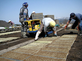 種蒔を蒔いた後には苗だしが待っていますこれが結構大変です。箱を一枚一枚並べて行くのですが箱が重たいのです男性は3枚・女性は2枚と言う暗黙の了解の中、箱を並べていきますスクワット状態です!冬に太った体が重たいのですがそこは何とか気力で頑張っています。写真右下の量で1日かかりです。残り4回合計5枚の田んぼが全て苗で一杯に・・・全ての田んぼが写真では入りきれないほどの面積になります。