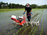 除草機を押していますこれがなかなか難しく少しでもずれてしまうと稲を踏み倒してしまいます。